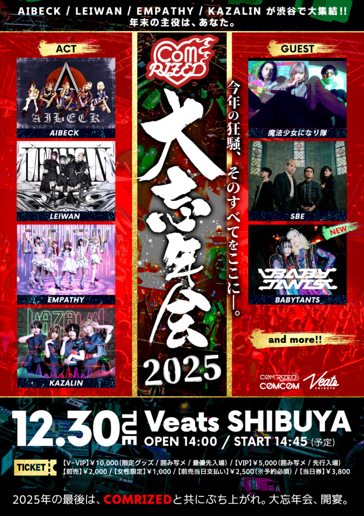2025/11/08(土) 仙台MACANA Drop After Dawn pre. 4th SINGLE “REVIVE” RELEASE TOUR 2025 -FINAL 2025 12/19 TITLE COMRIZED 大忘年会 2025 DATE 2025/12/30(火) VENUE 渋谷 Veats TIME OPEN 14:00 / START 14:45 TICKET チケットはこちらから LIVE LIVE-LIVE