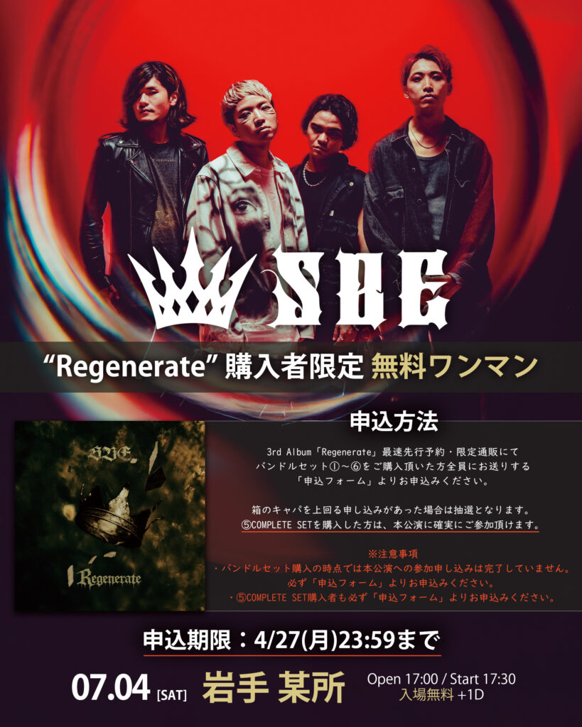 TITLE SBE "Regenerate Tour" DATE 2026/10/11(日) VENUE 高松 TOONICE TIME OPEN 17:30 / START 18:00 TICKET 前売 ¥4,000 / 当日 ¥4,500 チケットはこちらから オフィシャル一次先行(抽選) 4/12(日)23:59まで -