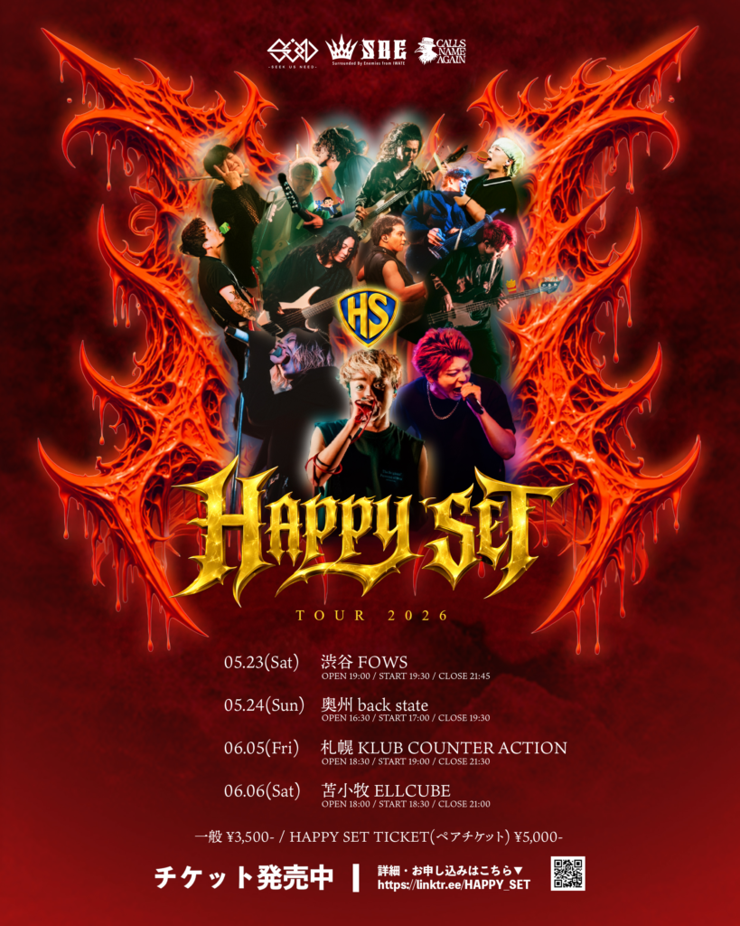 TITLE "HAPPY SET TOUR 2026" DATE 2026/05/23(土) VENUE 渋谷 FOWS TIME OPEN 19:00 / START 19:30 / 終演 21:45 TICKET 前売 ¥3,500 / HAPPY SET TICKET(ペアチケット) ¥5,000 チケットはこちらから -