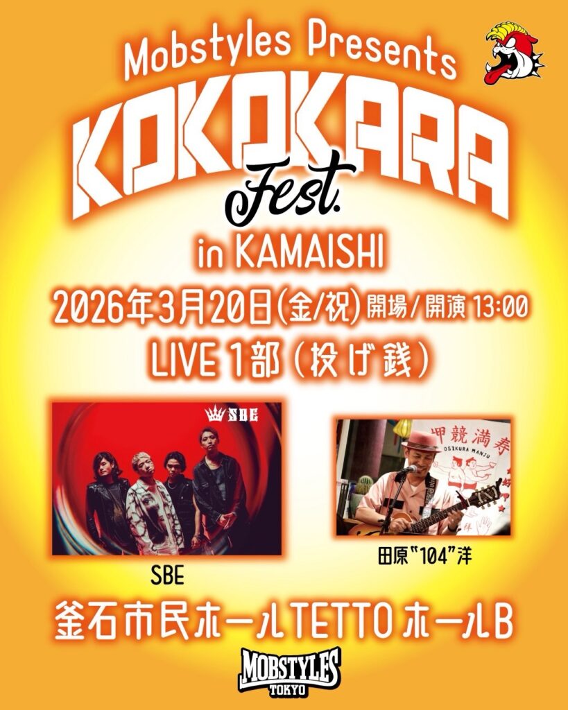 TITLE MOBSTYLES「KOKOKARA」第一部 DATE 2026/03/20(金祝) VENUE 釜石市民ホール TETTO ホールB TIME OPEN 13:00 / START 13:00 TICKET チケット不要!無料です! 出演田原104洋SBE バンドセット、40分超のロングセットです! -